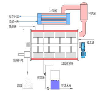 ⑥當(dāng)筒內(nèi)廢水被干化至固態(tài)(減量95%以上),設(shè)備停止供熱,利用槳葉刮板的物理特性將固廢推出筒體;