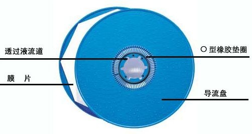 透過液流道:過濾膜片由兩張同心環狀反滲透膜組成,膜中間夾著一層絲狀支架(如圖2),使通過膜片的凈水可以快速流向出口。這三層環狀材料的外環用超聲波技術焊接,內環開口,為凈水出口。透過液在膜片中間沿絲狀支架流到中心拉桿外圍的透過液通道,導流盤上的O型密封圈防止原水進入透過液通道(如圖2)。如圖2所示透過液從膜片到中心的距離非常短,且對于組件內所有的過濾膜片均相等。