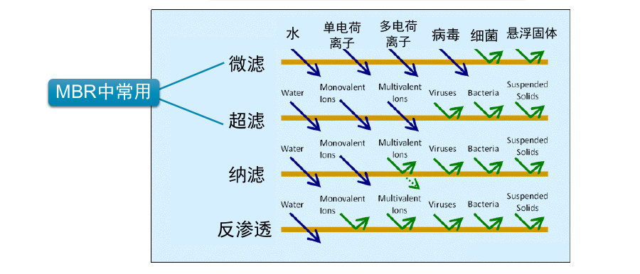 MBR膜式由不同孔徑的高分子材料組成的一種特殊的化學制品,分別為微濾膜、超濾膜、納濾膜和反滲透膜幾種,下圖就是MBR膜不同孔徑下可以阻隔或截留的各種物質的類型: